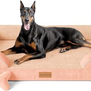 XXL Dog Bed for Extra Large Dogs, Giant Orthopedic Dog Bed with Cooling Gel Memory Foam, Waterproof Pet Bed with Removable Washable Cover, 53″ Pet Sofa bed Dutch Velvet with Bone Toy, Peach Pink