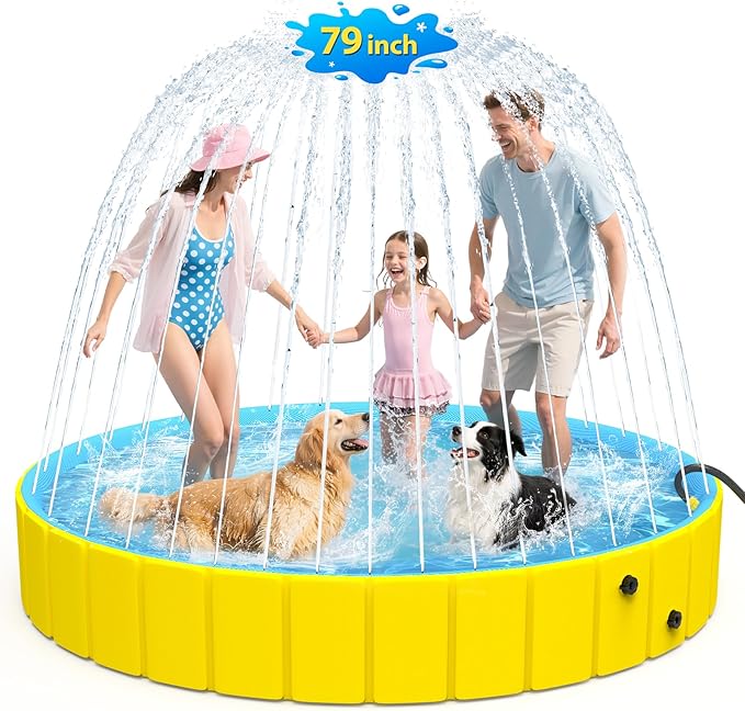 - 【Dog Pool with Extra Space】With a generous 79” diameter and 12” height, this oversized dog pool easily fits 3–4 kids and multiple large dogs for fun playtime together. Whether you use it as a swimming pool, toy pool, pet bed/nursing area, or transform it into a ball pit or sandbox, it handles it all with ease. The unique splash feature creates sprays of water all around for endless fun, turning your backyard or lawn into a cool summer paradise in seconds