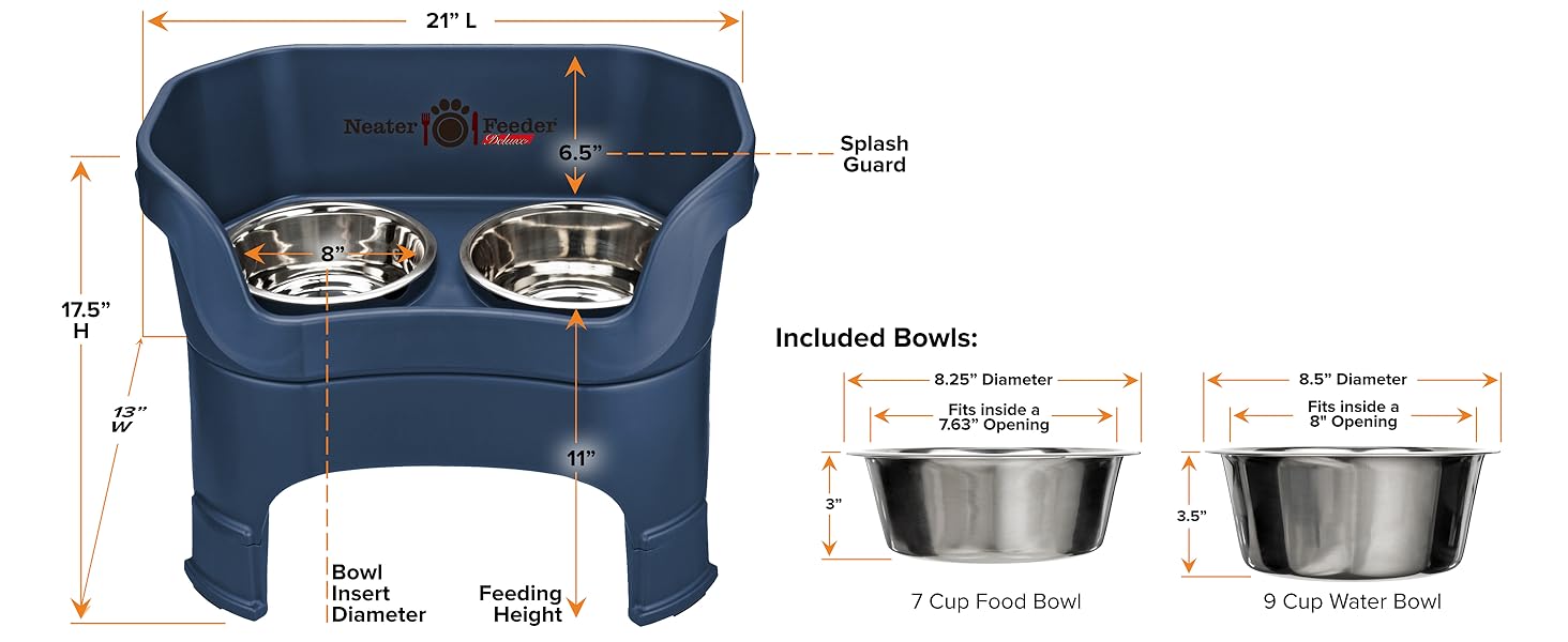 - ELEVATED DOG BOWLS FOR LARGE DOGS: Designed for large-sized dogs like Labradors and Golden Retrievers, the Neater Feeder Large Dog with Leg Extensions measures 21” L x 13” W x 17.5” H (with an 11” feeding height). It is recommended for dogs over 40 pounds with a shoulder height over 14″. The set includes a 7-cup dog food bowl & a 9-cup extra-capacity water bowl.